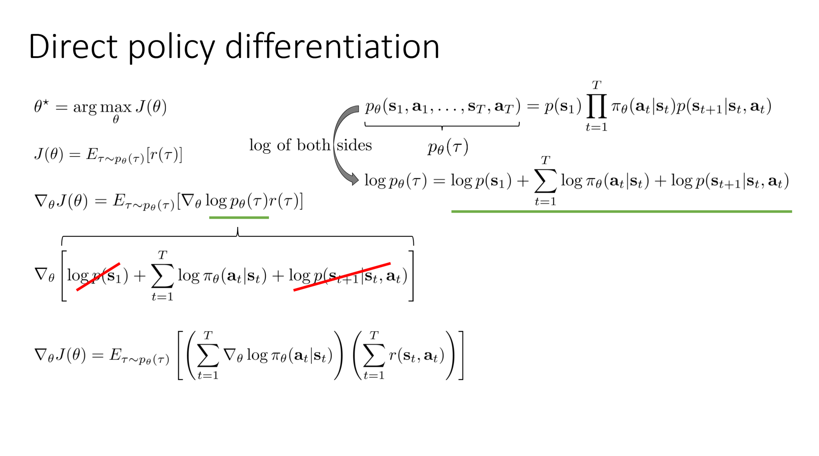 \[\nabla_{\theta}J(\theta)\approx\frac{1}{N}\sum_{i=1}^{N}\left(\sum_{t=1}^{T}\nabla_{\theta}\log\pi_{\theta}({\bf a}_{i,t}|{\bf s}_{i,t})\right)\left(\sum_{t=1}^{T}r({\bf s}_{i,t},{\bf a}_{i,t})\right)\]