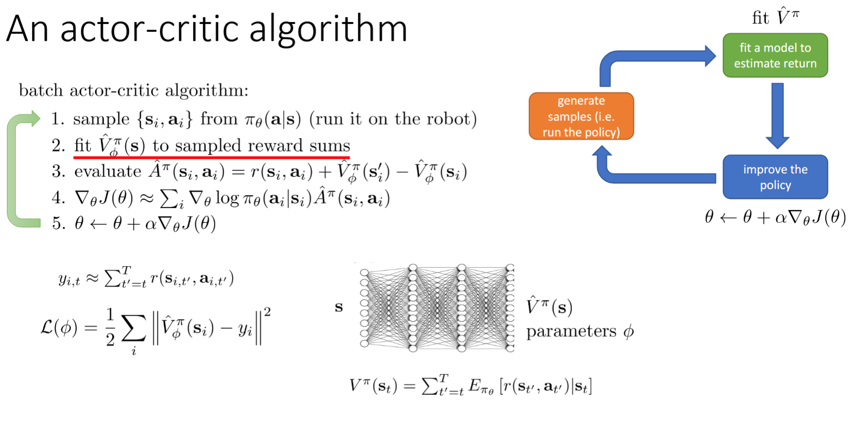 但也可以使用一个估算函数, 即function approximation, 这是个典型的监督回归问题, 可以用神经网络解决, 数据集为n轮训练中的 \(s_{i,t}\) 与其对应的从t开始的回报和 \(\left\{\left({\bf s}_{i,t},r({\bf s}_{i,t},{\bf a}_{i,t})+\hat{V}_{\phi}^{\pi}({\bf s}_{i,t+1})\right)\right\}\) , loss设置为平方误差和 \(\mathcal{L(\phi)}=\frac{1}{2}\sum_{i}\left|\left|\hat{V}_{\phi}^{\pi}(\mathbf{s}_{i})-y_{i}\right|\right|^{2}\)
