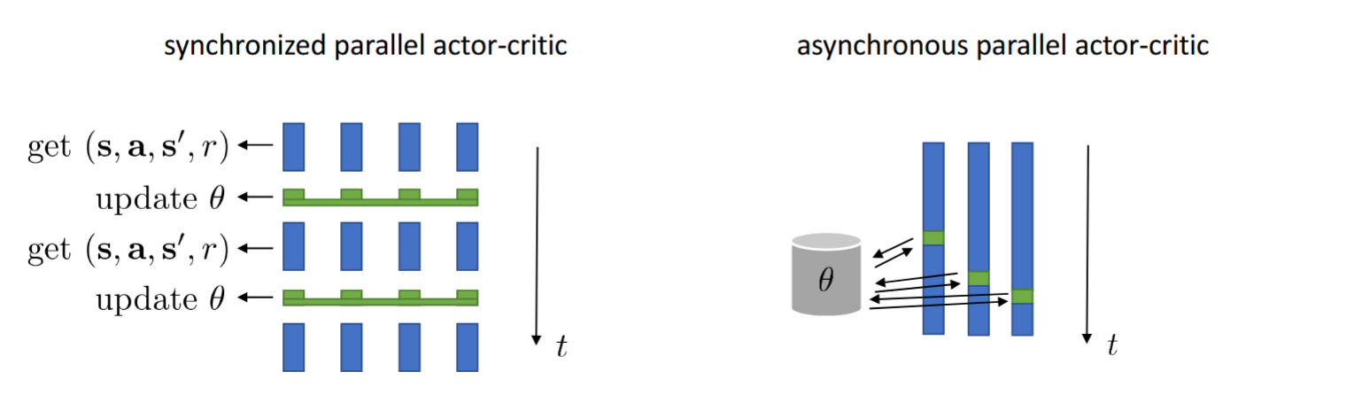异步的情况下, 不同线程可能有不同的运行速度, 并各自用收集到的数据更新网络参数, 这样的效率更好, 但缺点是, 较慢的线程更新时可能遇上新版本的actor, 也就是说会有这种用非当前actor的数据更新它的问题, 当然一般来说因为线程之间的速度不会有特别大的差别, 影响相对不大
