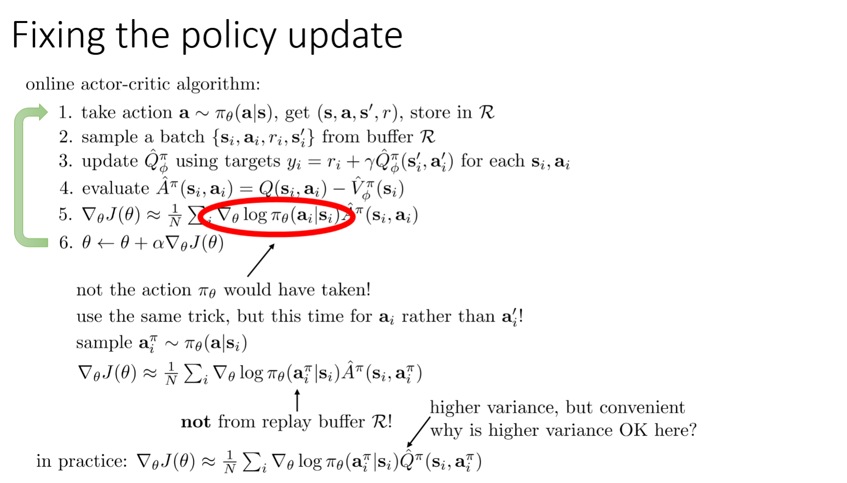 \[\nabla_{\theta}J(\theta)\approx\frac{1}{N}\sum_{i=1}^{N}\sum_{t=1}^{T}\nabla_{\theta}\log\pi_{\theta}({\bf a}_{i,t}|{\bf s}_{i,t})\left(\hat{Q}_{i,t}-Q_{\phi}^{\pi}({\bf s}_{i,t},{\bf a}_{i,t})\right) +\frac{1}{N}\sum_{i=1}^{N}\sum_{t=1}^{T}\nabla_{\theta}E_{\mathrm{a}\sim\pi_{\theta}({\bf a}_{t}|{\bf s}_{i,t})}\left[Q_{\phi}^{\pi}({\bf s}_{i,t},{\bf a}_{t})\right]\]