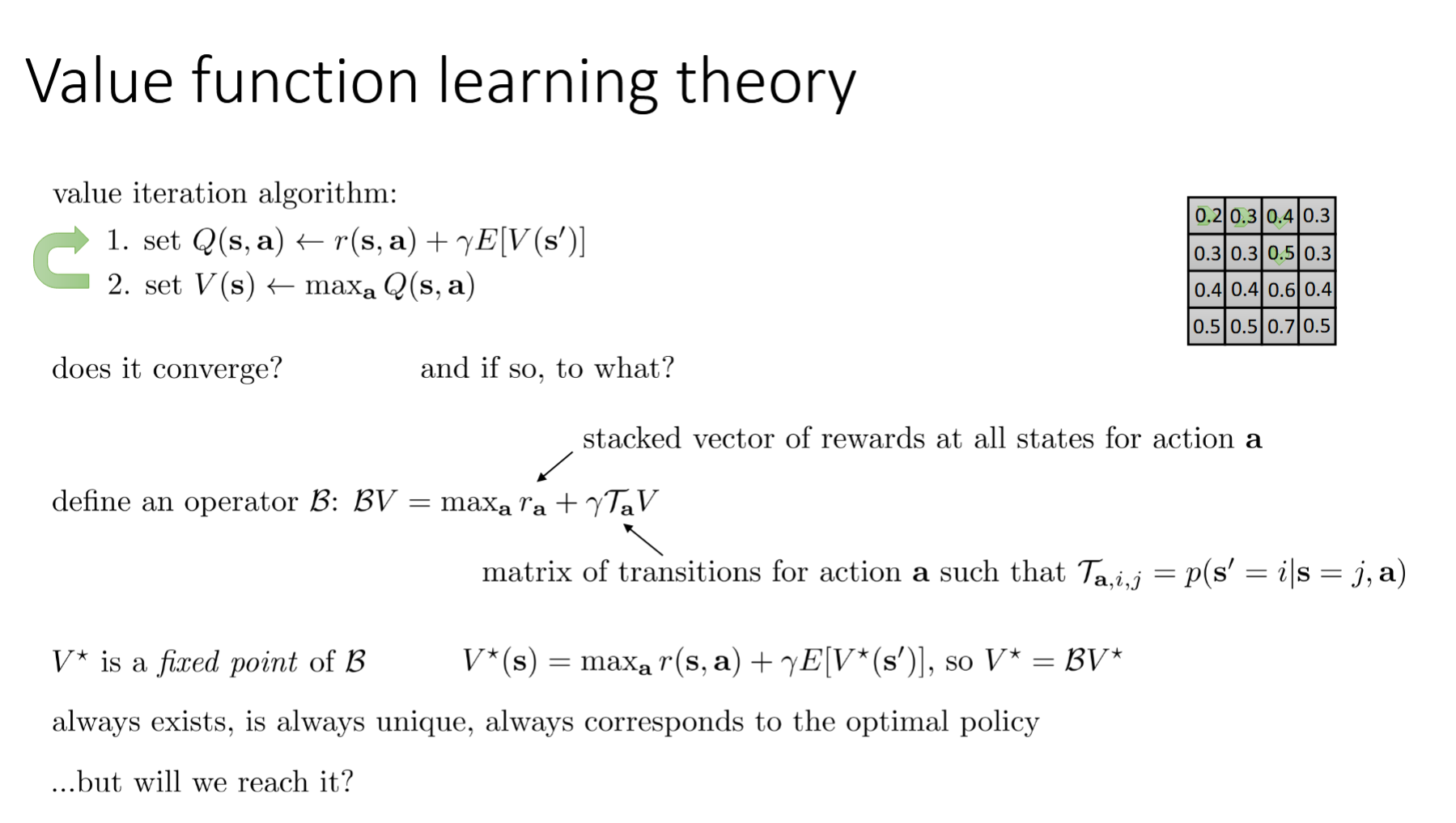 设想一个类似“终点”的最优状态 s, s 有全局最佳的 V, 只要到达 s 就可以宣告游戏结束, 例如一个跑酷游戏的终点。那么对离 s 一步之遥的 s', 迭代到它后, s'更新自己的价值为 迈出最后一步(action)的回报+s的价值(为了容易说明, 这里假设迈出这步到达 s 的概率是 1), 如果总共只有这两种状态, 由于 s 不会更好了, s'达到 s 也没有更好的路径, 继续迭代也不会更新, 问题解决了