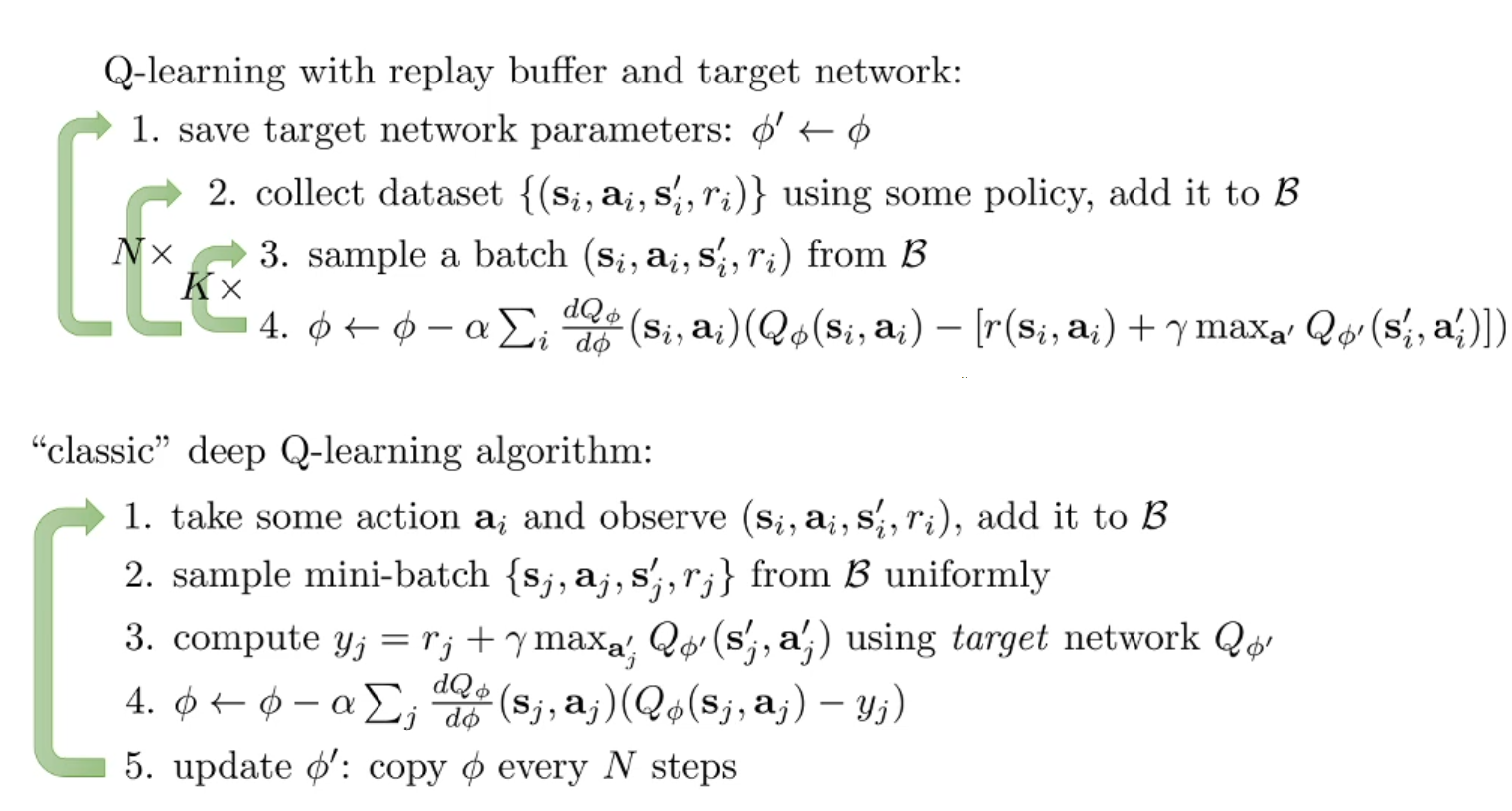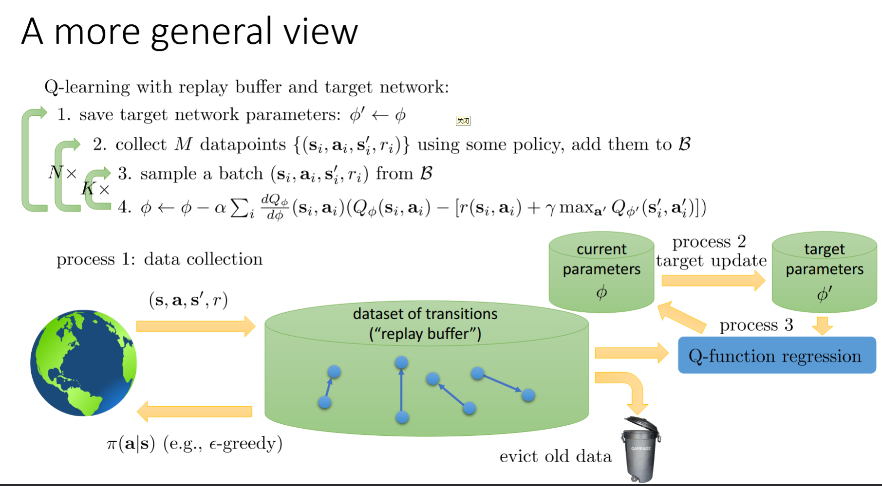 课程此前提到过的 off-policyrl, 例如 Q 学习实质上依旧依赖一个数据 buffer, 执行有偏的策略或者 Q 函数更新, 因此必须每隔一段时间更新数据或者让一个子进程来不断更新 buffer