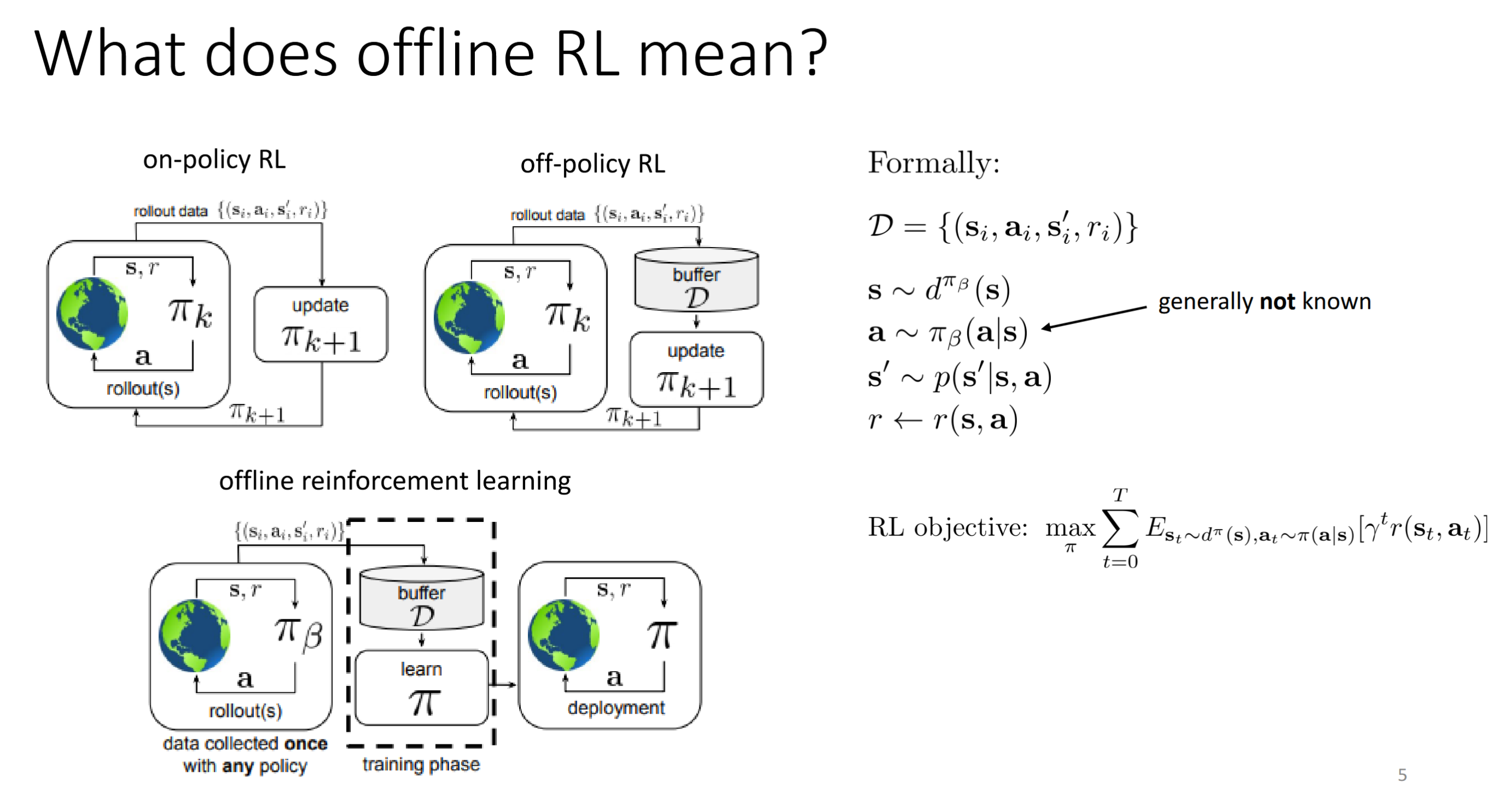 o-p rl 的目标是, 给定一个数据集 D, 只用这个数据集来学习, 用于得到数据集的策略和要学习的策略 π 完全无关, 找到一个策略 π 最优化 J 函数, 也就是初始状态的期望总回报