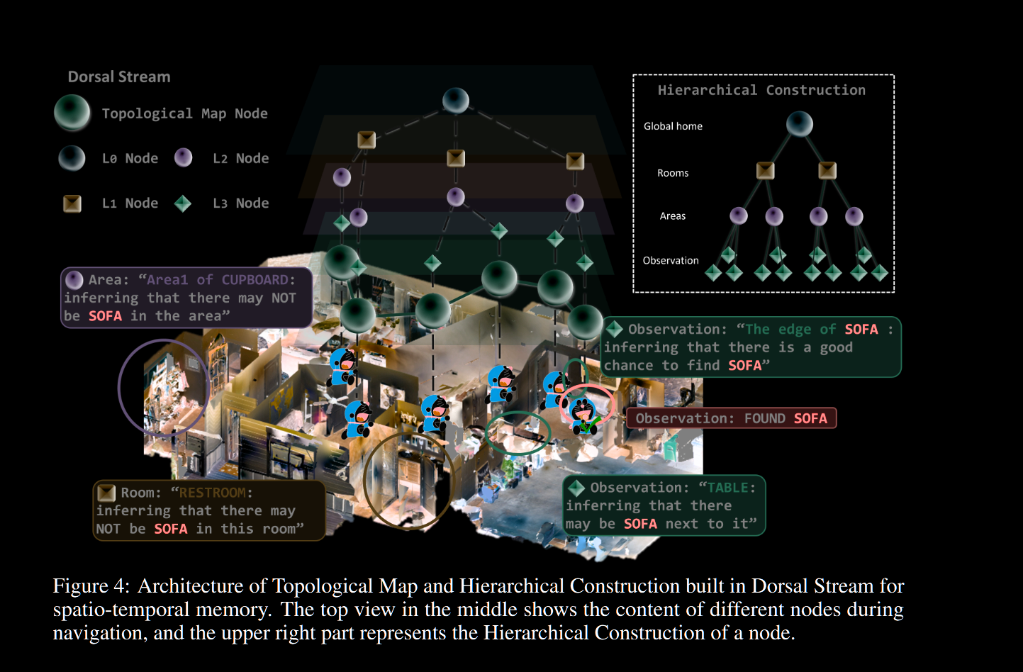 具体而言, 本系统的地图称为载体关系场景图(CRSG), 它基于一个开放词汇实例图 M, 结构上分为 建筑与房间层、载体层、承载层和其他对象层位移对象导航策略