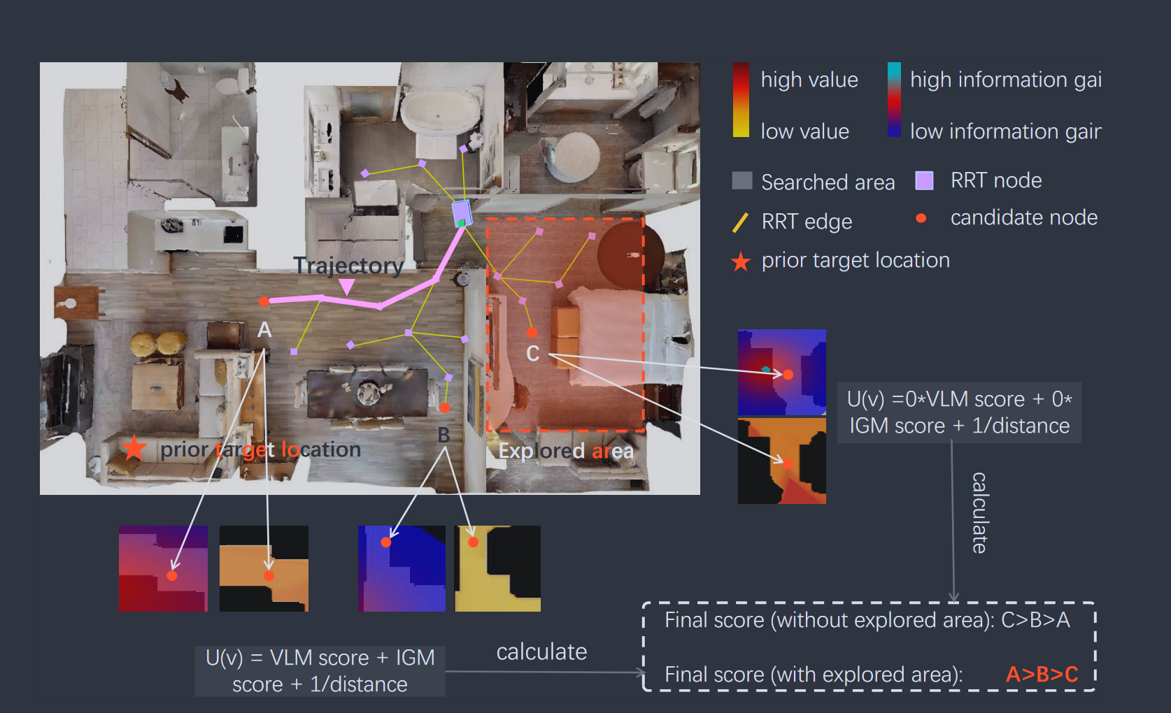 总结: 每轮中在候选对象里优先级排序, 对最佳候选对象的位置, 机器人导航到此处并探索是否存在目标对象; 如果没有候选对象但有为探索载体对象, 让 llm 选一个候选者进行探索; 在探索过程中, 机器人会不断更新 map 且寻找新的候选对象或者载体对象