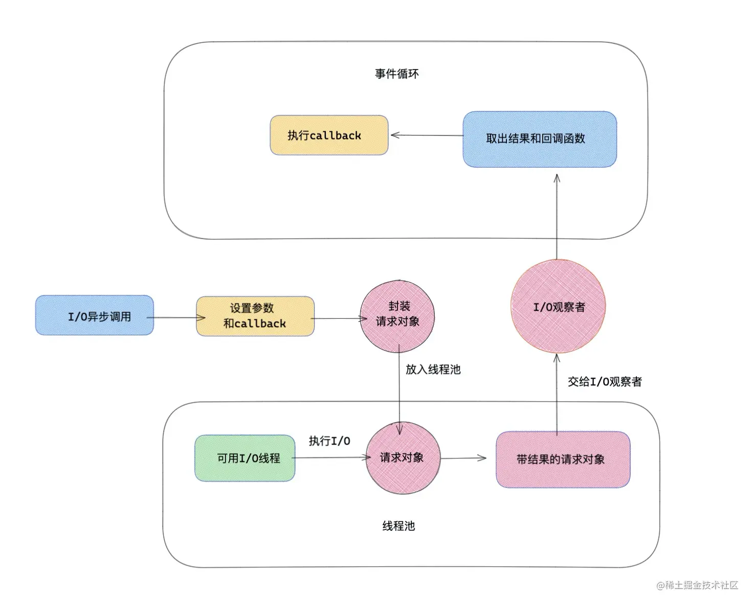 Nodejs 内部使用了线程池来处理异步 I/O 任务,线程池中会有多个 I/O 线程来同时处理异步的 I/O 操作, 流程如下图所示